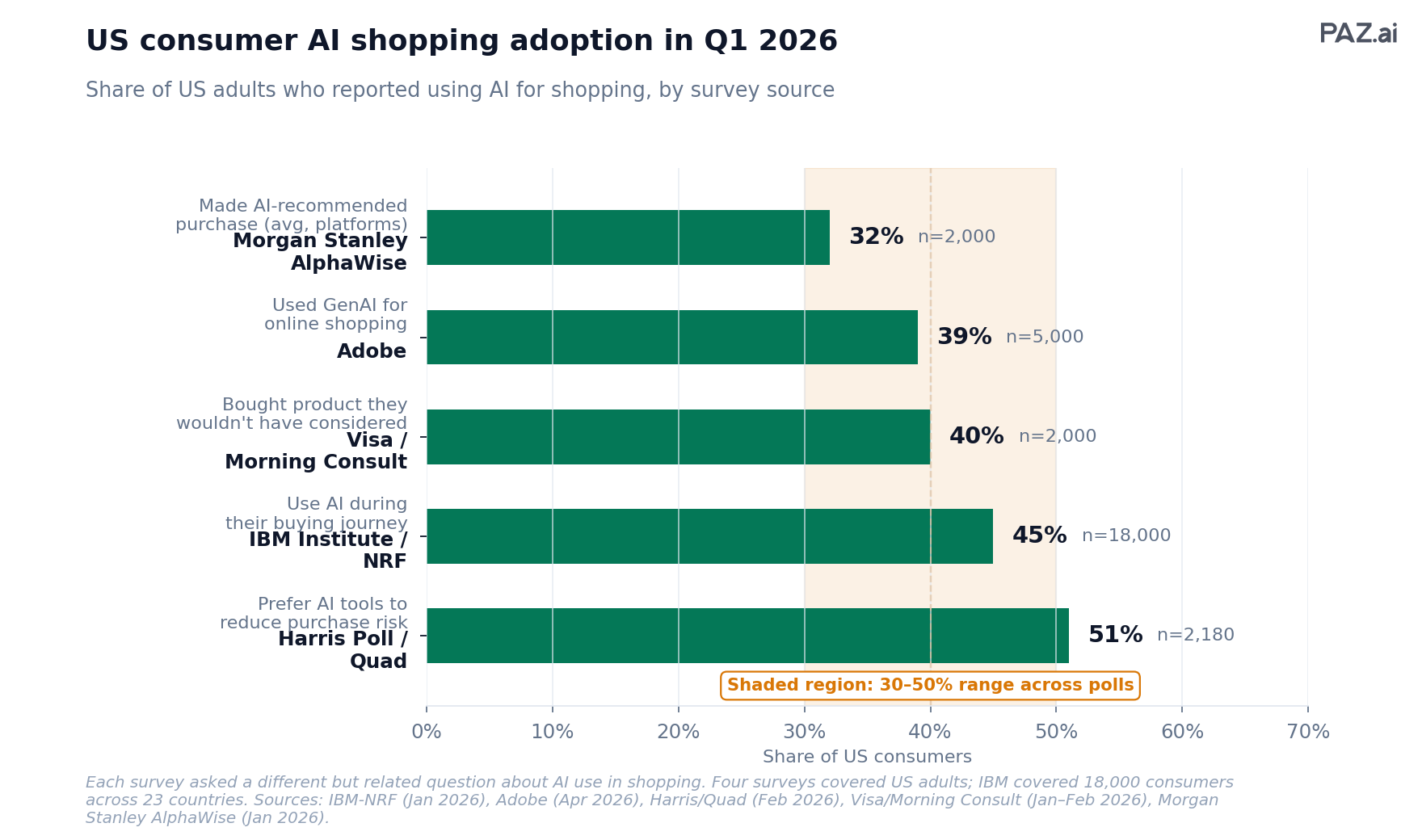 Between 30% and 50% of US online adults, depending on question phrasing. The IBM Institute for Business Value survey with the National Retail Federation (n=18,000 across 23 countries) says 45% of consumers turn to AI during their buying journey. Harris/Quad (n=2,180) says 51% prefer AI-powered shopping tools. Visa (n=2,000) says nearly 40% made a purchase they would not have considered because of AI. Adobe (n=5,000) says 39% have used generative AI for online shopping. Morgan Stanley AlphaWise (n=2,000) shows 20 to 40% across specific AI platforms.