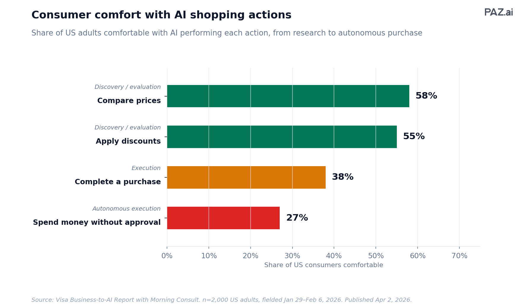 This is the finding that explains the market's biggest Q1 2026 reversal. Visa asked the same 2,000 US adults about four AI shopping actions, ordered from pure research to fully autonomous transaction: