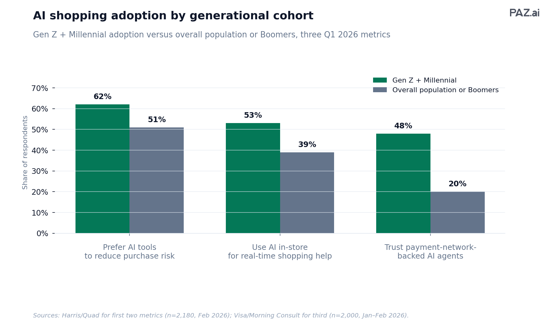 - 48% of Gen Z trust payment-network-backed AI, versus 20% of Boomers (Visa).