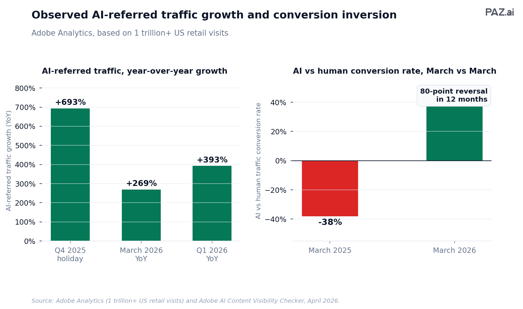 Adobe Analytics found AI-referred traffic converted 42% better than human traffic in March 2026. A year earlier, AI traffic converted 38% worse than humans. The reversal is one of the largest channel conversion shifts ever recorded in ecommerce.